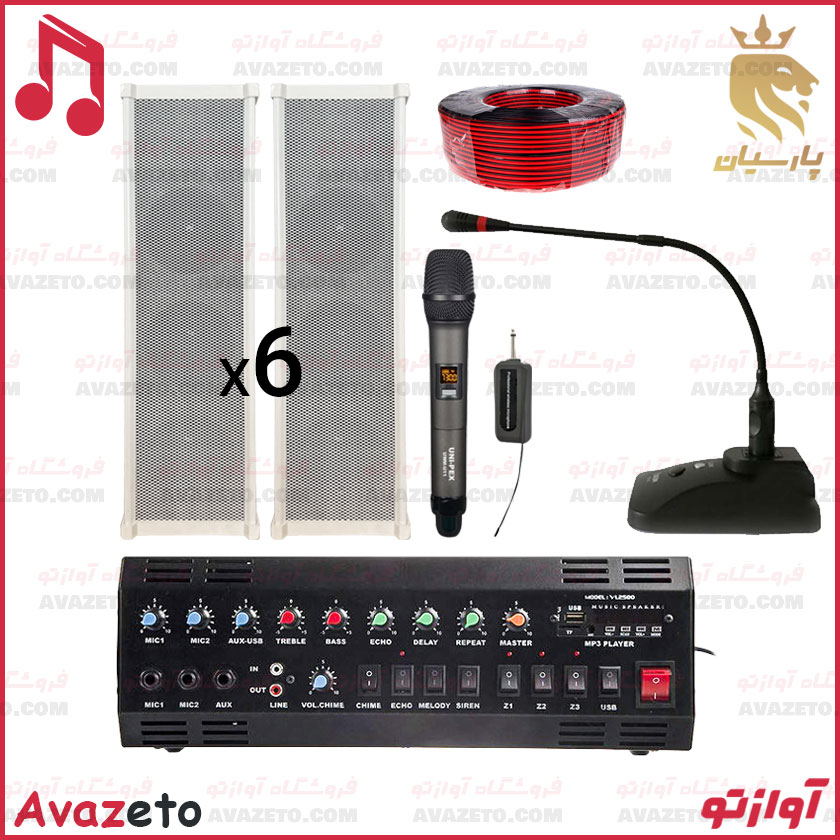 در این پکیج سیستم صوتی مدرسه از برند پارسیان، 6 عدد بلندگو ستونی به همراه یک کلاف کابل صوتی جهت اتصال بلندگوها به آمپلی فایر قرار دادیم. یک عدد میکروفن رومیزی و یک عدد میکروفن بیسیم که برای جابجایی مناسب باشد. در مجموع این پکیج نیازهای یک سیستم صوتی مدرسه را در 90% مواقع برطرف میکند در صورتی که نیاز داشتید مشاوره یا تغییراتی در پکیج داشته باشید حتماً با کارشناسان آوازتو تماس بگیرید تا با توجه به نیازتان شما را راهنمایی کنیم.